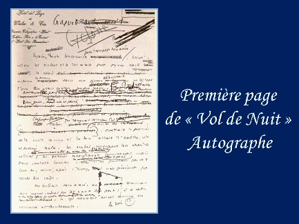 Cette description consacre toutes les particularités que nous avons soulignées. Et si nous regardons la première page autographe – entièrement raturée – du manuscrit de Vol de Nuit, nous comprenons que Saint-Exupéry choisissait ses images, son vocabulaire, ses tournures stylistiques avec une application qui exclut le hasard. Combien sont nombreuses les reprises, corrections surchargées ! Il savait travailler dans le moindre détail une atmosphère, un cadre de vie, des échanges, une vision directe ou mémorisée.